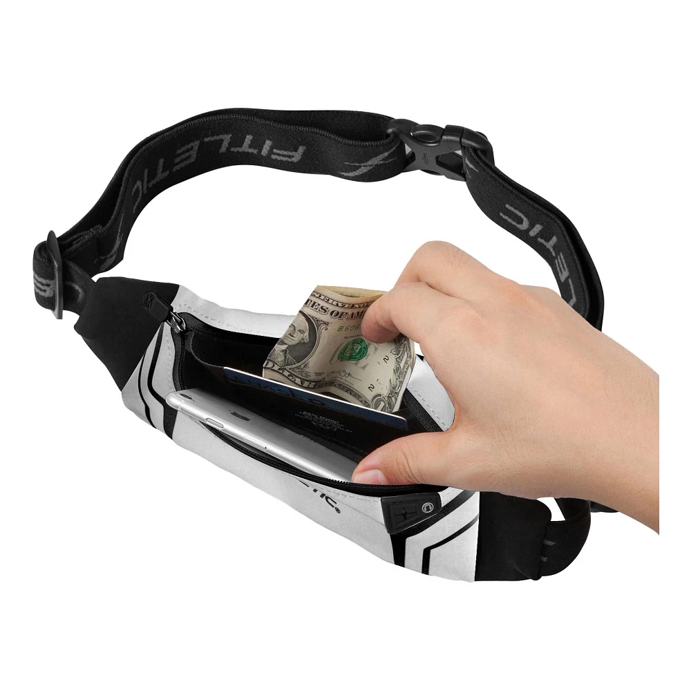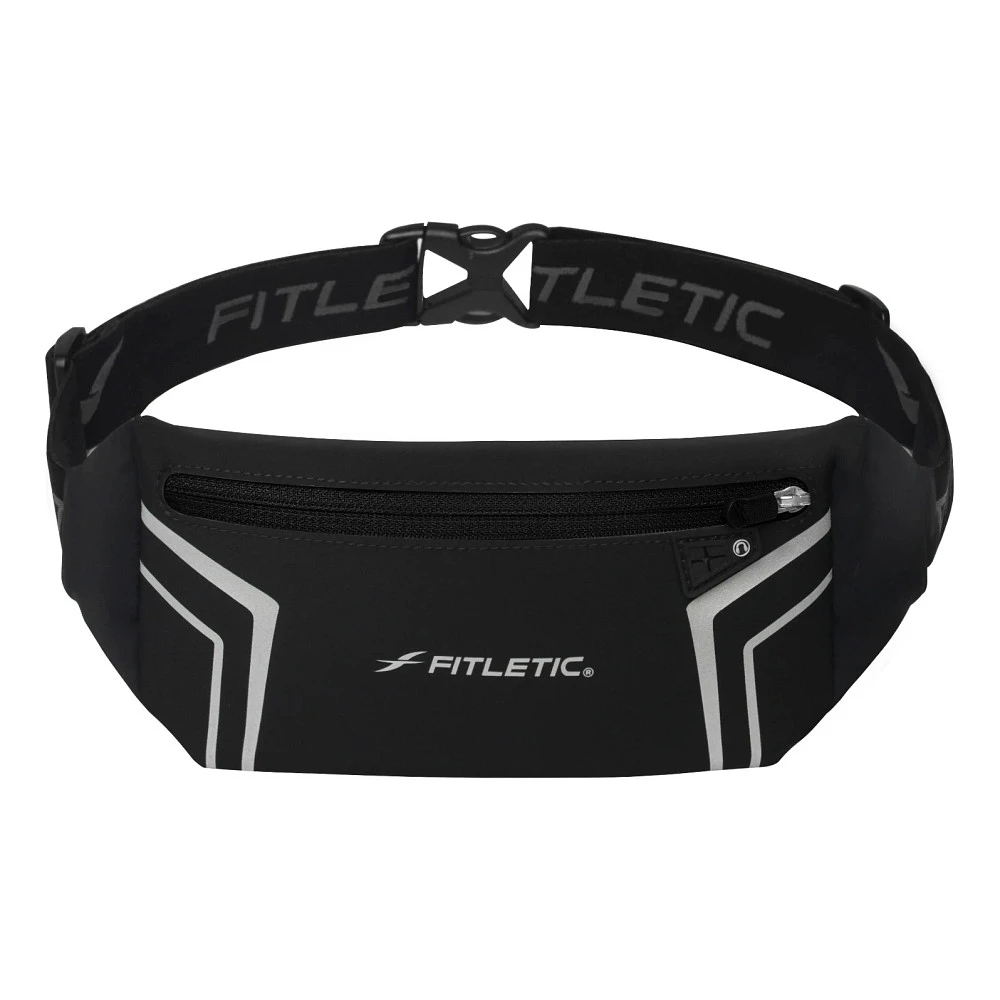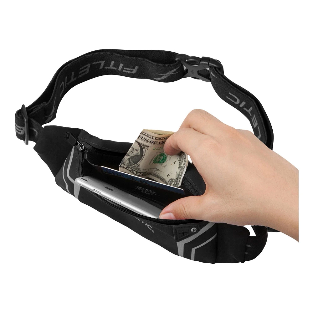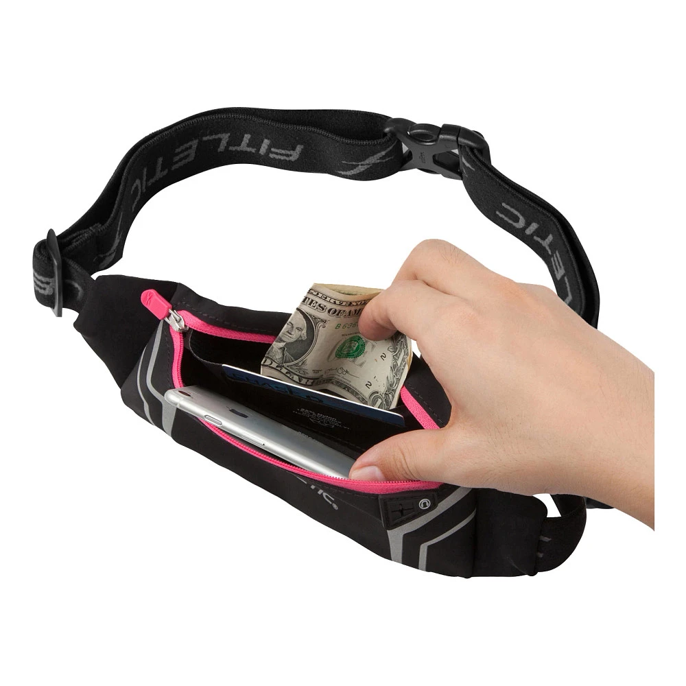 Fitletic® Blitz :: A patented, rainproof design for travelers, concertgoers, and more. Created for sunrise, dusk and nighttime runs, the Blitz running belt is also ideal for anyone who wants to protect their valuables from rain. The moisture-resistant pouch has plenty of space to stow key essentials including a passport. The phone pouch includes ear bud ports so you can run with your favorite playlist. The reflective strips help make you more visible in low-light conditions, alerting drivers to your presence. This belt is a safe bet for all kinds of outdoor athletes: runners, walkers, joggers, bicyclists, roller-bladders, and even Winter athletes. It is a cool accessory for globetrotters who want to carry their passports and be more hands-free.