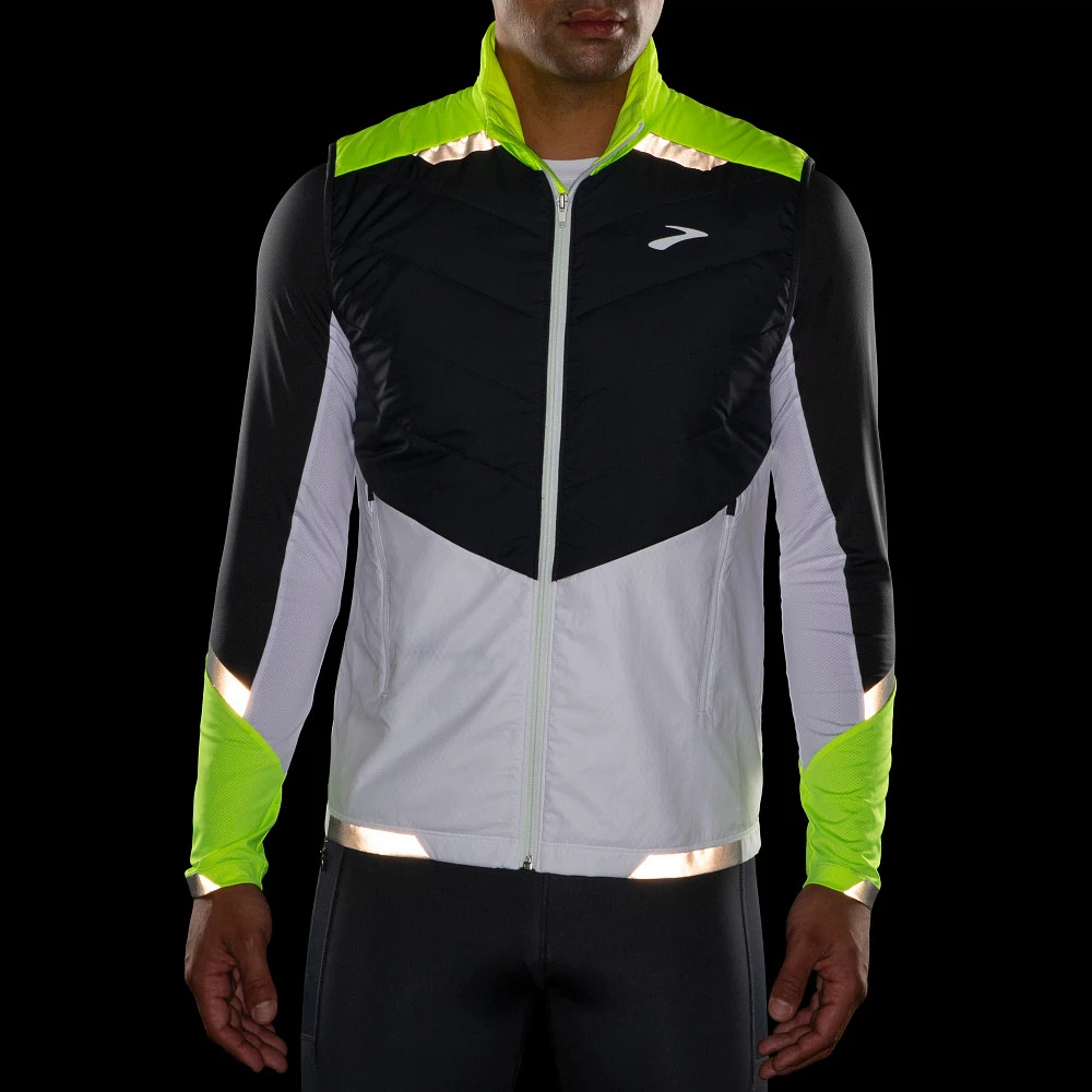 Men’s Brooks® Run Visible Insulated Vest :: Take on the night with the Men’s Brooks Run Visible Insulated Vest. Brilliant 3M™ Scotchlite™ Carbon Black Stretch Reflectivity and Brooks Nightlife Yellow, let you stand out in one of the most visible colors to the human eye. Constructed from weather resistant materials, stay warm and dry on your toughest runs.