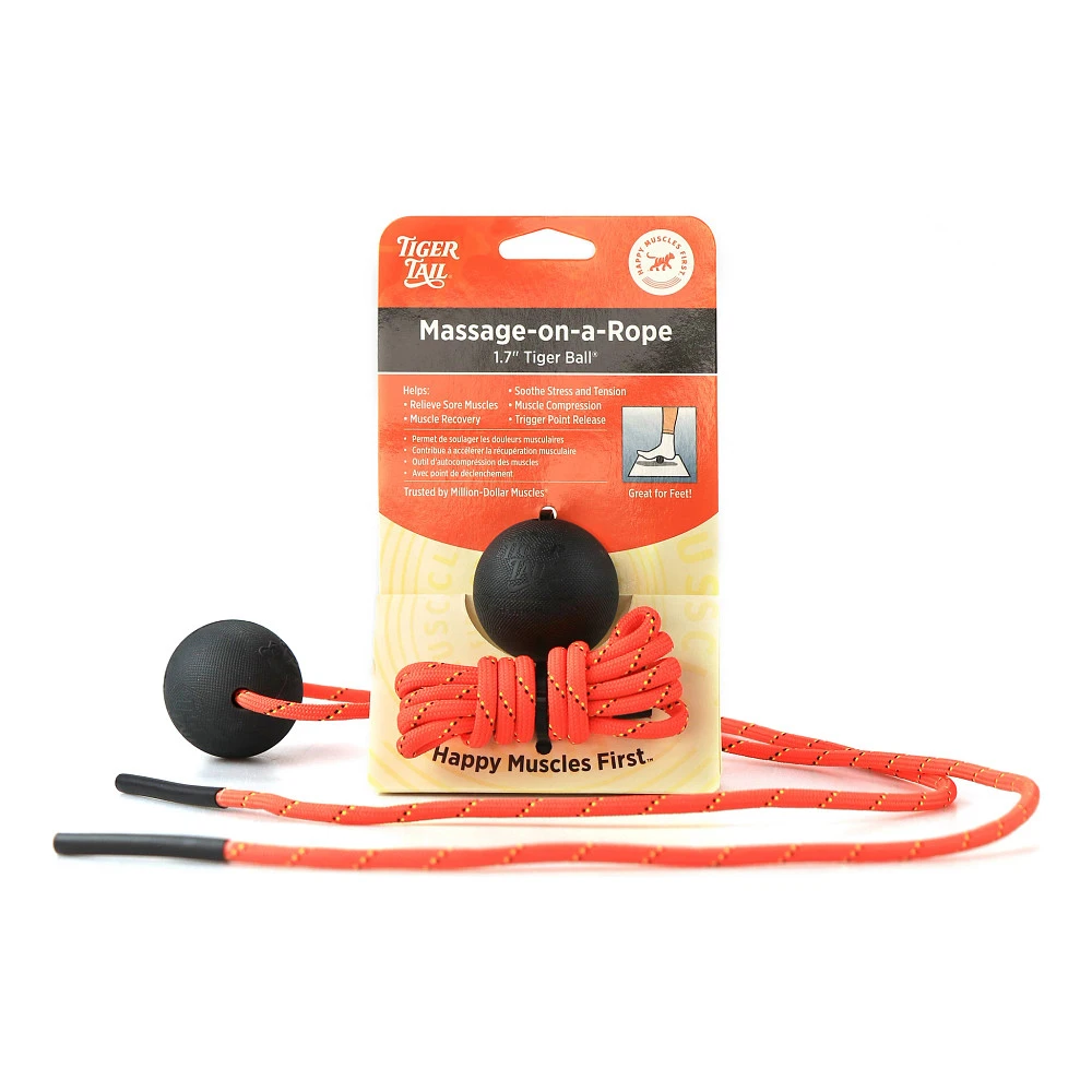 Tiger Tail® Tiger Ball® 1.7 Massage-On-A-Rope® :: Don’t let those hardworking, hard to reach muscles be neglected! Tiger Tail Tiger Ball 1.7 Massage-On-A-Rope is everything you never knew you needed in massage tech. Ideal for working out sore muscles in the feet, back, shoulders, neck, arms, and everywhere in between. Named for its 1.7″ of glorious surface area to really dig deep in hard to soothe and relax knots and tightness. It features a durable rubber ball and 55″ corded rope with handles to add and release pressure where it’s needed most.