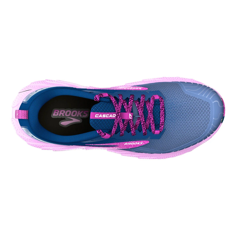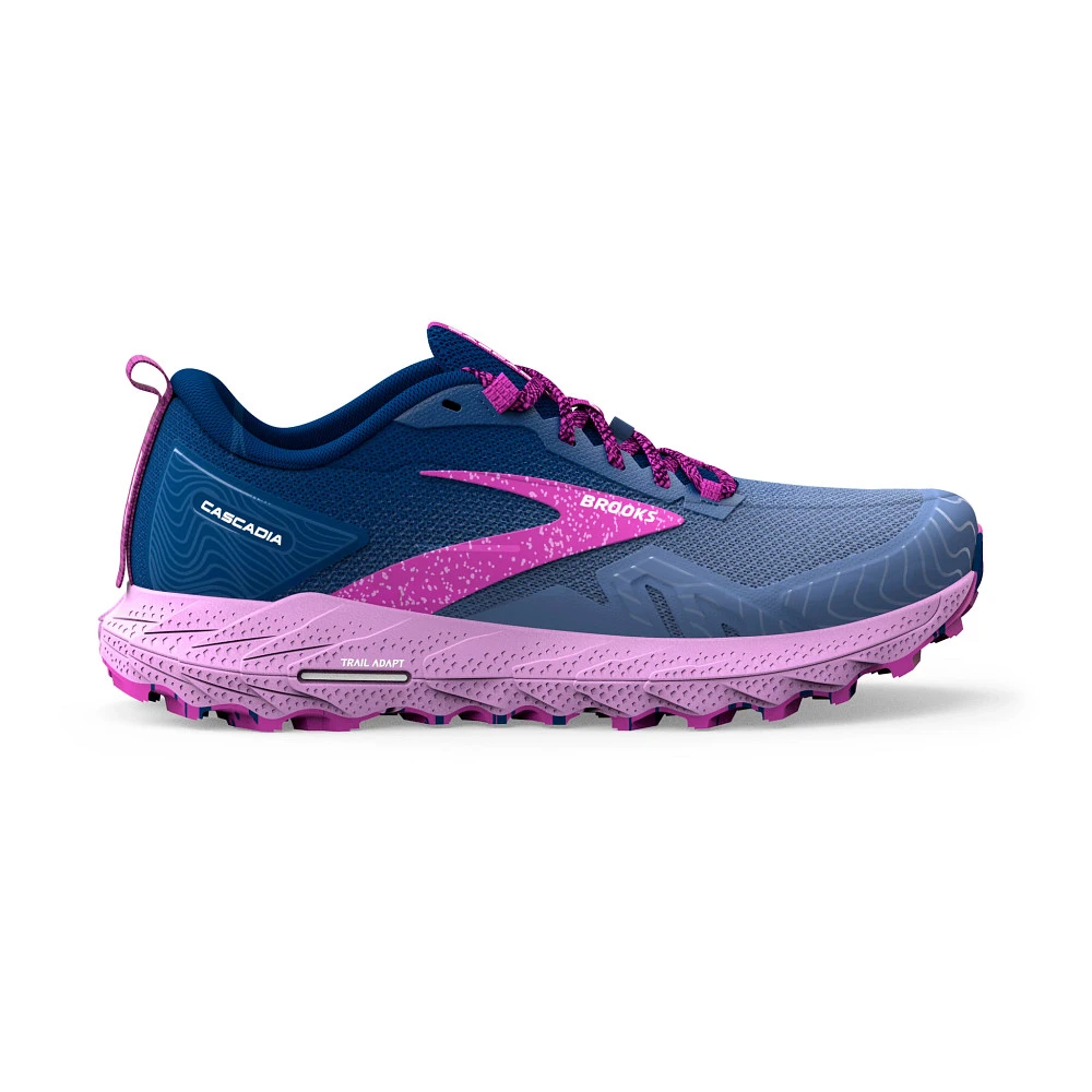 Womens’:s BROOKS® CASCADIA 17 :: A shoe as tough as you are. Your updated Women’s Brooks Cascadia 17 has all the bells and whistles you need to hit the trail with confidence. With a robust Trail Adapt System made up of midsole, rock plate and outsole, you’ll be prepared for any terrain. TrailTack Rubber technology made with 25% recycled content, provides stable wet-dry traction, just one more reason this version is a no-brainer! Show off the Cascadia 17’s unique PrintDyed upper that saves 66% of energy and 75% of water typically needed in traditional dye processes.