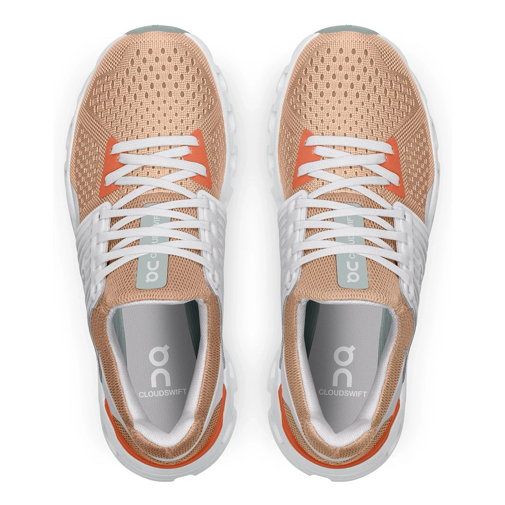 Women’s ON® CLOUDSWIFT :: Slip into ultimate comfort in the new On Cloudswift running shoes. With more Helionâ„¢ superfoam and more cushioning, it’s easy to feel like you’re running on clouds. Tread lightly with a 100% recycled mesh upper designed for a more supportive feel. With repositioned CloudTec® technology in the forefoot for a smooth, rolling stride, new grippy rubber pads on the soles of your Women’s Cloudswift pack traction in every step.